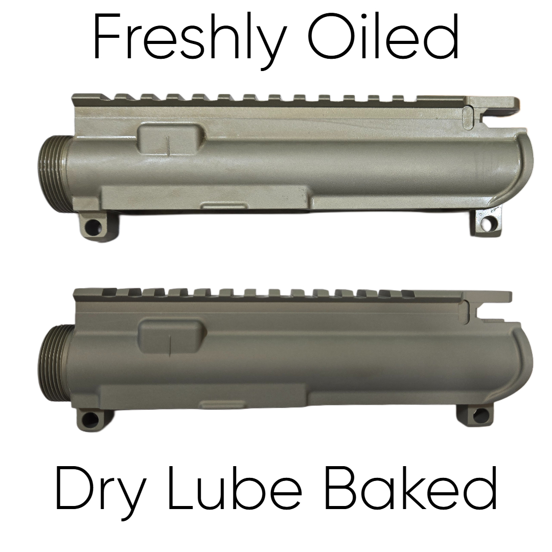 Our uppers currently have a coating of dry lube applied on the interior that does leave a gray tint inside the upper. Because of this process, the uppers are "baked" and result in a matte finish look. If a shiny appearance is the desired outcome, we recommend applying gun oil to the exterior of the upper, as it will change the overall appearance of the upper.